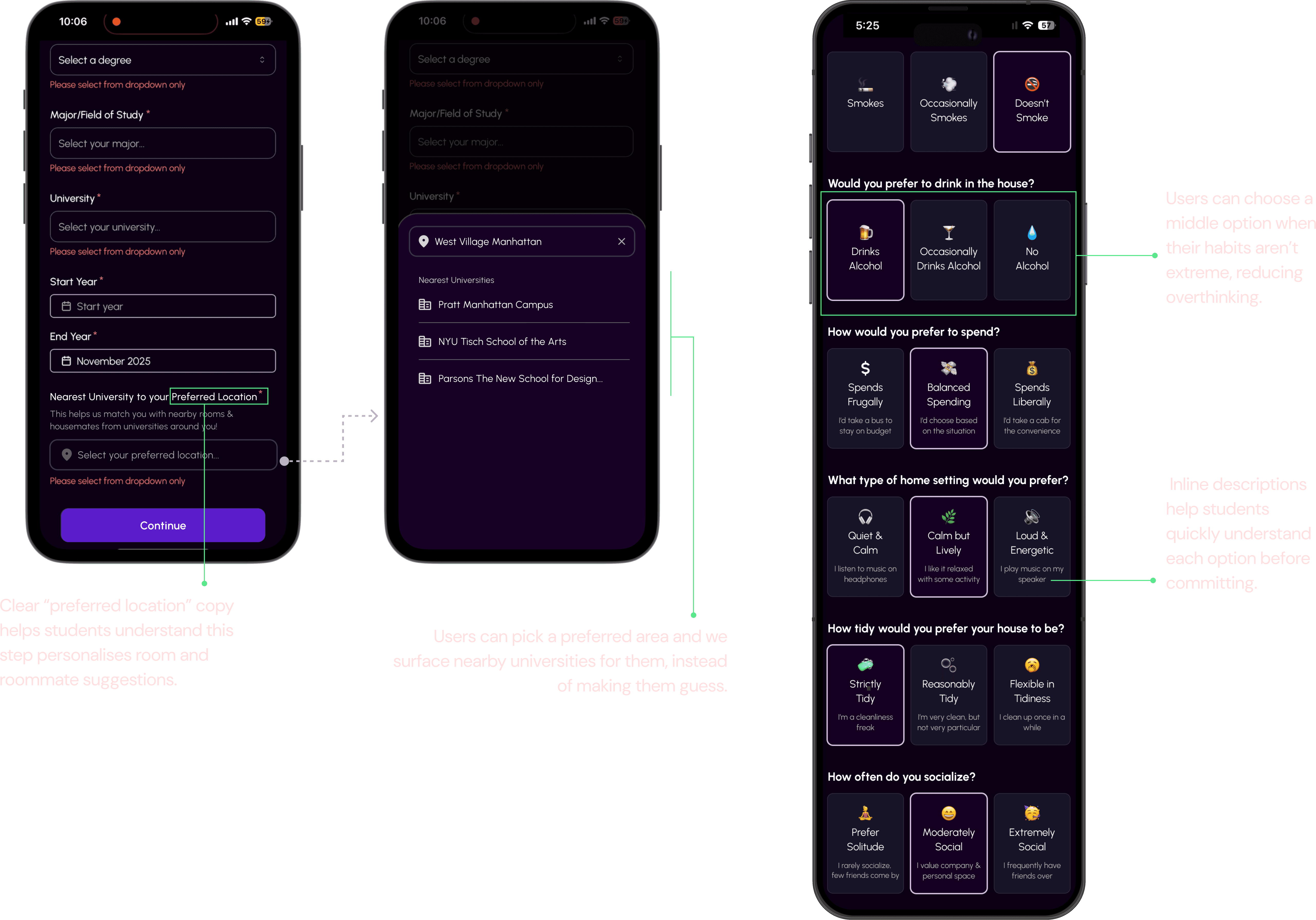 We clarified the purpose of location selection and introduced a more flexible preference model to make onboarding feel intuitive rather than restrictive. This helps students understand why certain inputs were needed and gives them options that better reflect their real-life habits. It encourages students to complete setup without hesitation.