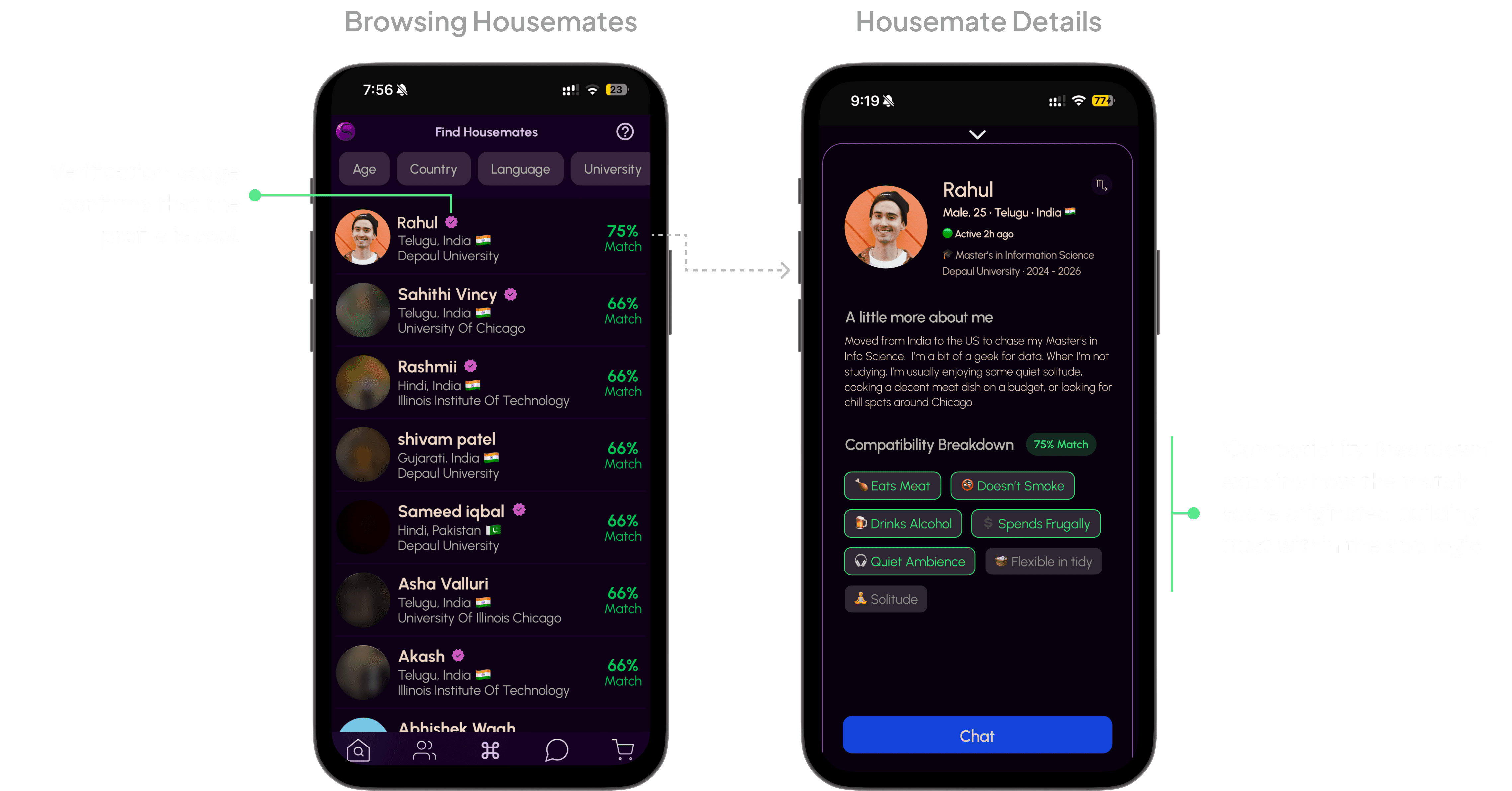 We added visible verification badges and a Compatibility Breakdown so students can immediately see which profiles are real and why