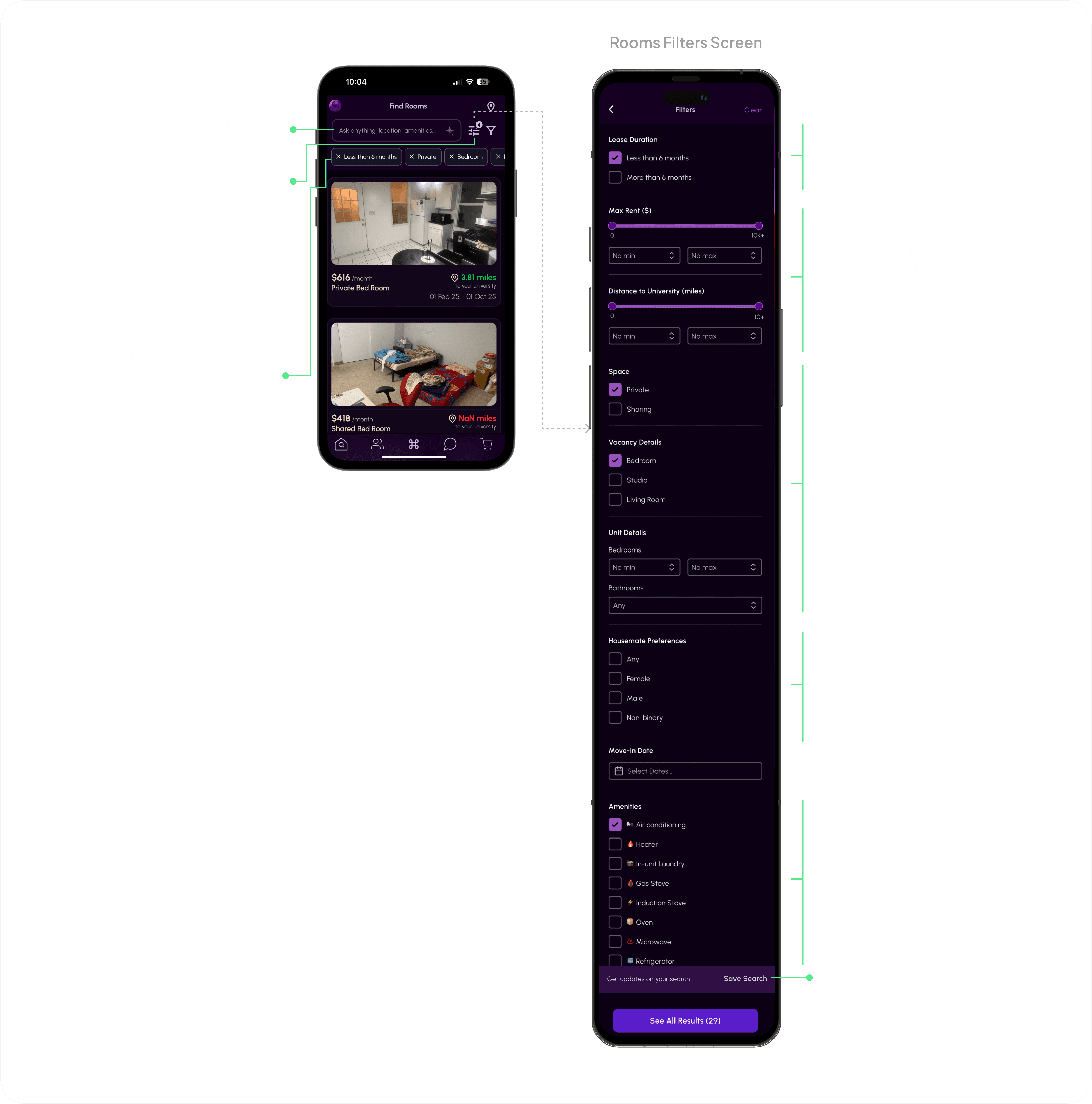 To improve search accuracy, we added a dedicated filter page with familiar controls, multi-select options, and a clear display of active