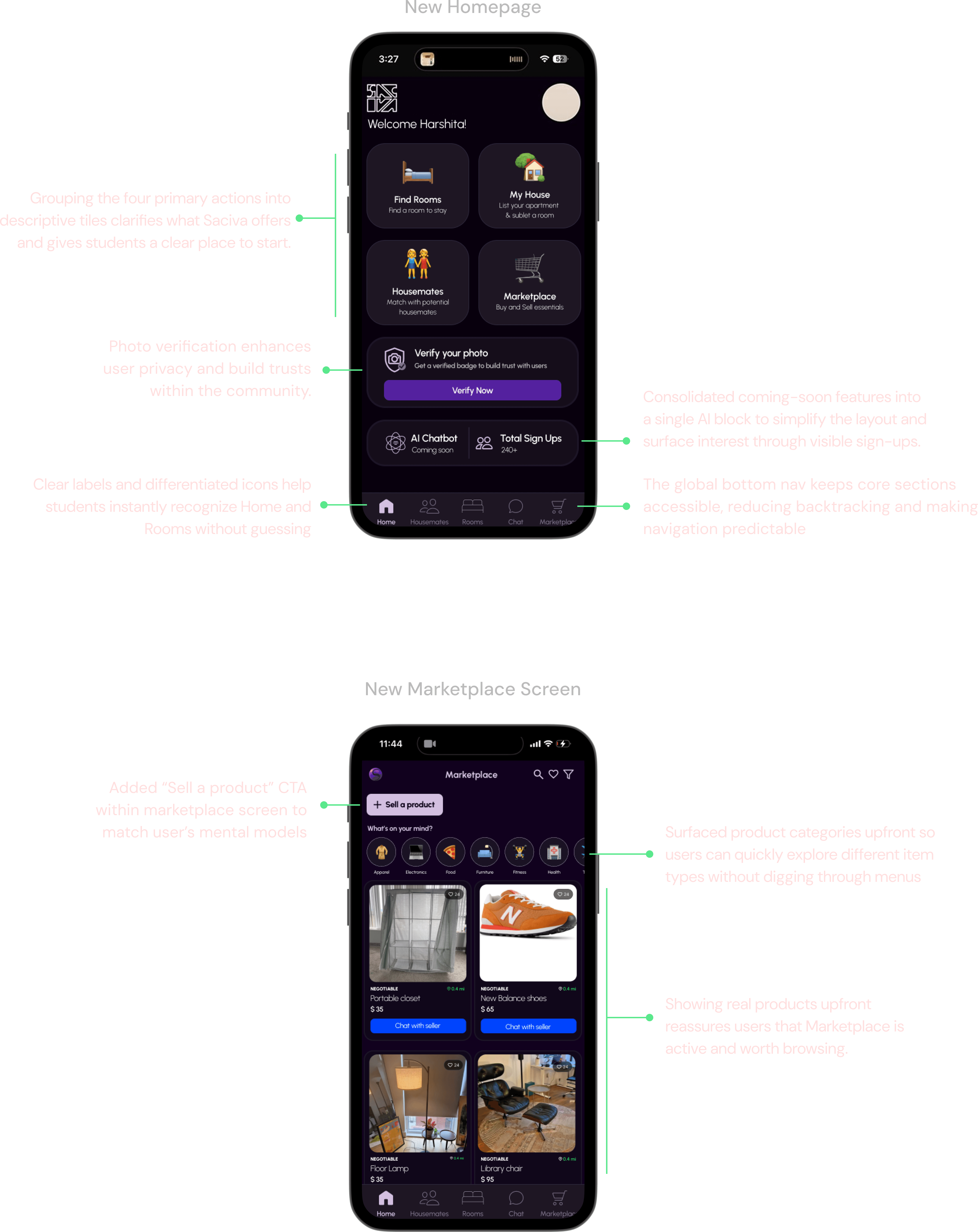 For Marketplace, we replaced the split buy/sell pathways with a single entry point and "Sell a product" CTA, and shifted focus from